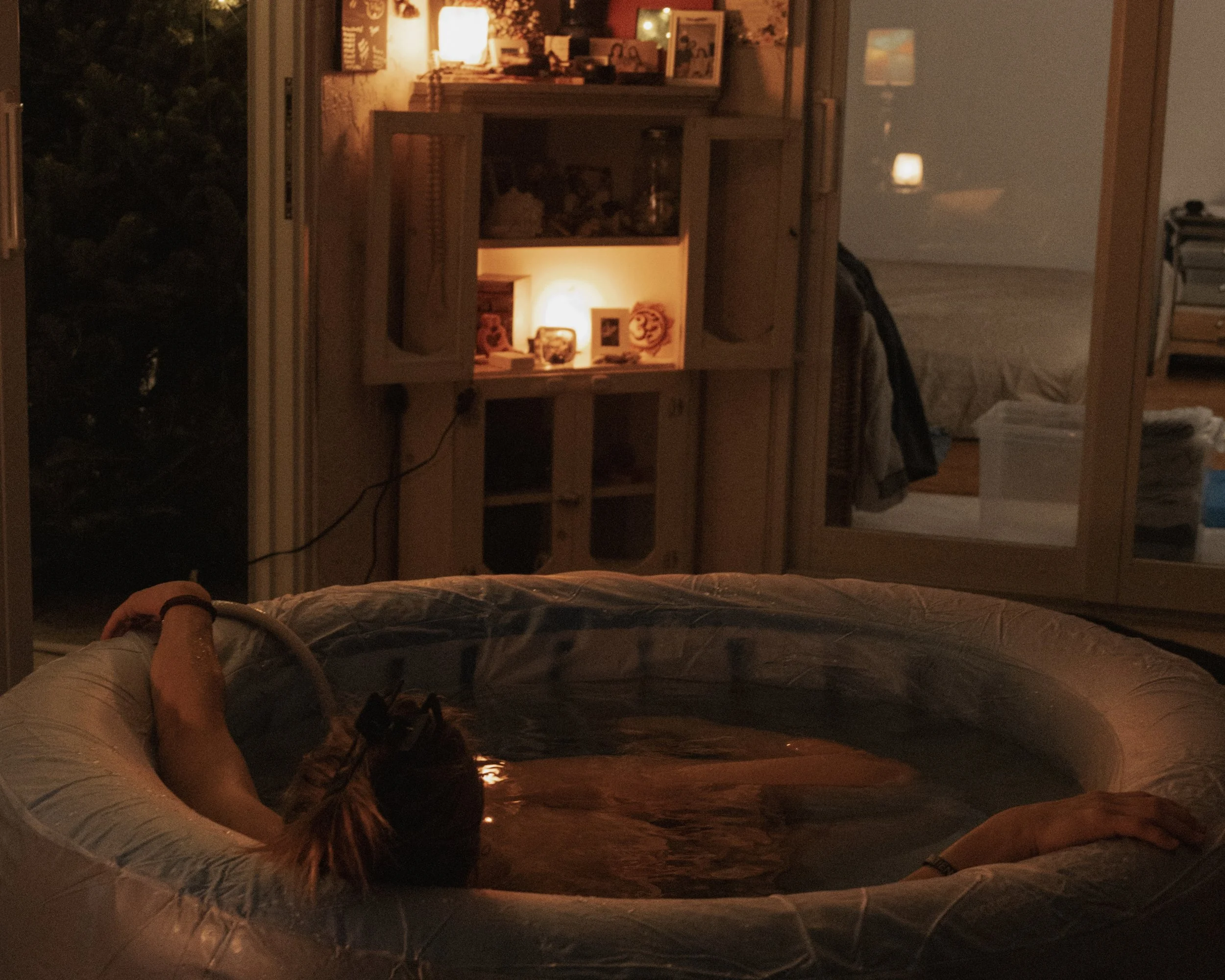 When the tub was finally ready it was dusk. It sat in front of my altar with family photos, heirlooms, and birth mantras. Amber light filled the porch. It smelled of fresh air as the storm grew closer. Christmas lights framed the doorway to our living room where my two midwives and photographer sat. It was exactly how I’d envisioned it.